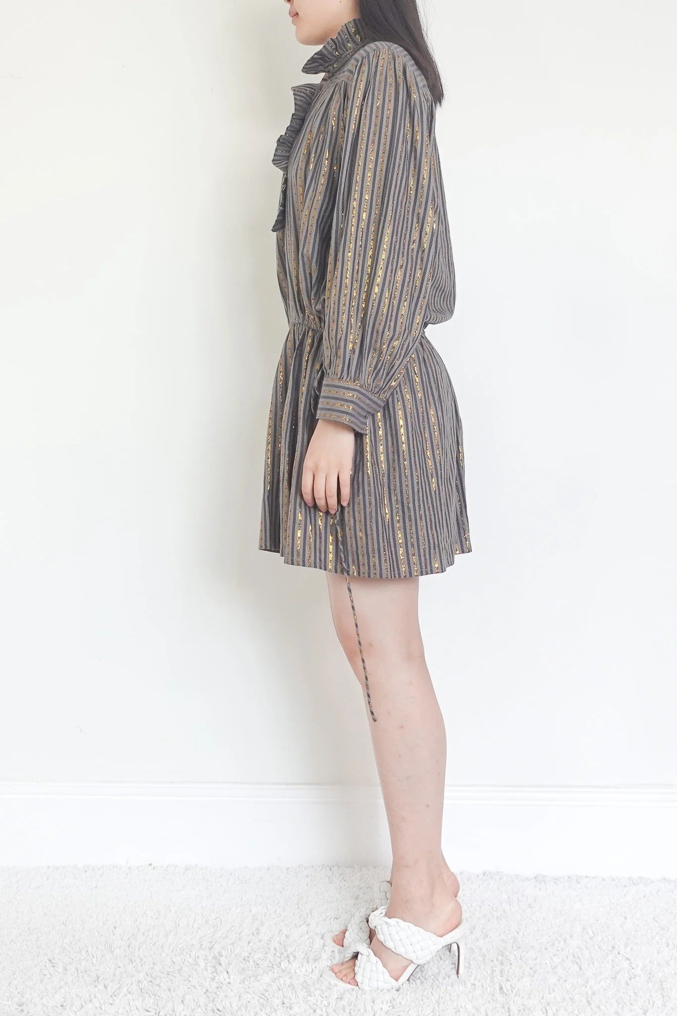 NEW Flowy grey and gold stripe print mini dress from features a frill style on the collar, long sleeves, button fastening on the collar, and drawstrings to adjust to waist. With a sparkling finish, this dress is perfect for the beach or a more breathable piece for the summer.