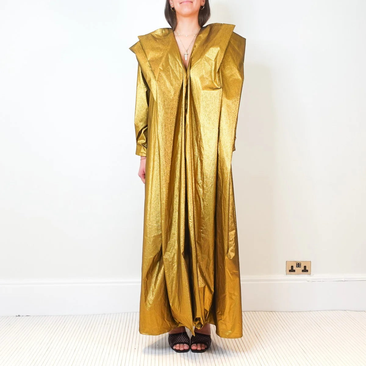 This gorgeous golden maxi length dress features a famous origami fabric detailing. The dress features a belted waist, with a large collar. The dress is finished with a slip on style for a comfortable fit.